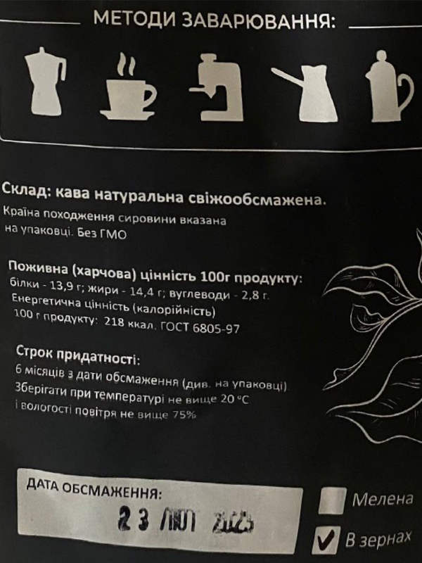 Склад: кава натуральна свіжообсмажена.Без ГМО