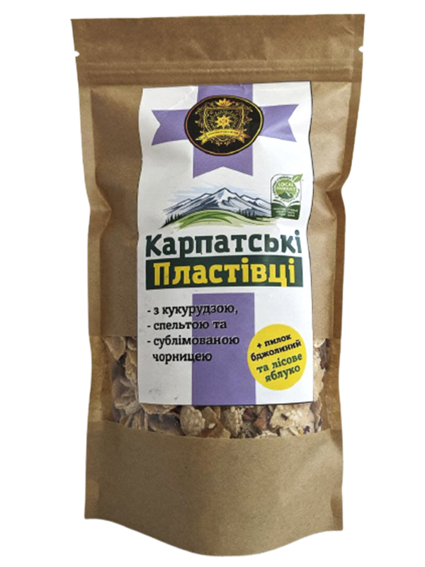Сніданок має бути корисним та поживним, кукурудзяні пластівці вироблені з натуральних зернових культур Карпат з додаванням бджолиного пилку та лісового яблука. Чудово смакує з кефіром, ряжанкою чи закваскою.