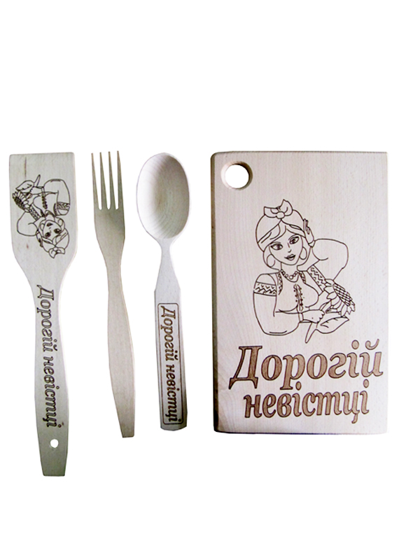 Невеликий набір "Дорогій невістці" складається з 4 предметів: обробної дошки з малюнком і написом, лопатки і ложки з написом, виделки.