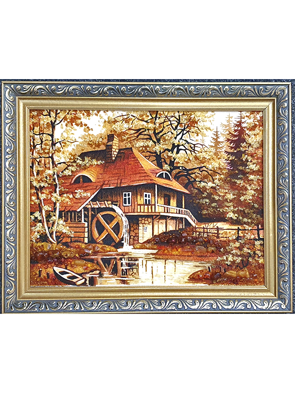Сонячна картина, виконана з бурштину з зображенням осіннього лісу, в якому затишно розмістився маленький будиночок.