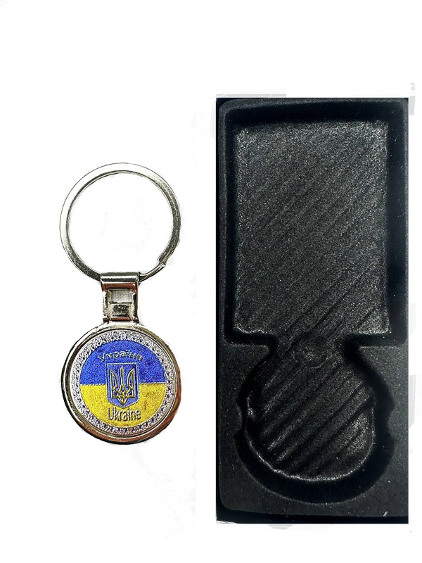 - Брелок в подарунковій упаковці Україна (фольга), прикрашений обрамленням із камінців.