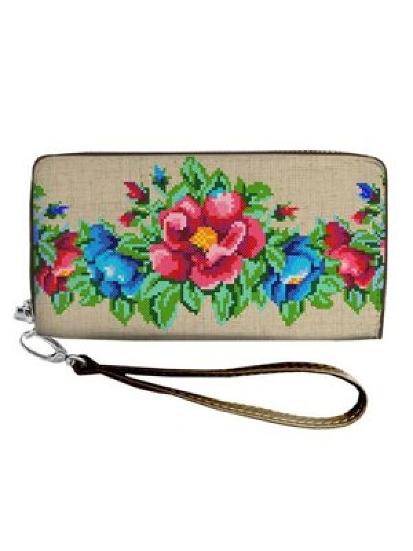Клатч - гаманець "Квіти" прикрашений квітковим візерунком на бежевому тлі. Має 1 відділення на замочку для дрібниць, 2 відділення для банкнот та 4 відділення для кредитних карт.