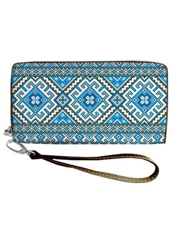 Стильний гаманець "Синій мотив" з красивим етнічним візерунком. Має 1 відділення на замочку для дрібниць, 2 відділення для банкнот та 4 відділення для кредитних карт.