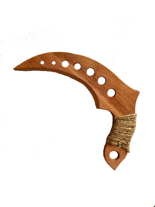Дерев’яний ніж з мішковиною карамбіт (більший) світлий — це стильний декоративний виріб, створений у формі популярного ножа карамбіт. Оригінальний дизайн і зручний розмір роблять його цікавим аксесуаром для колекціонерів, поціновувачів сувенірів та любителів виробів із натурального дерева.