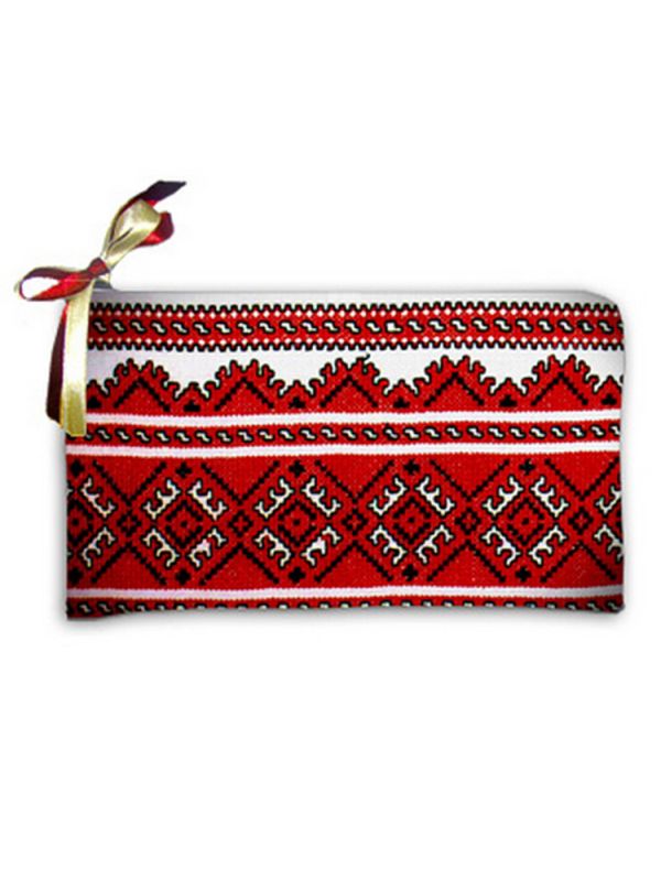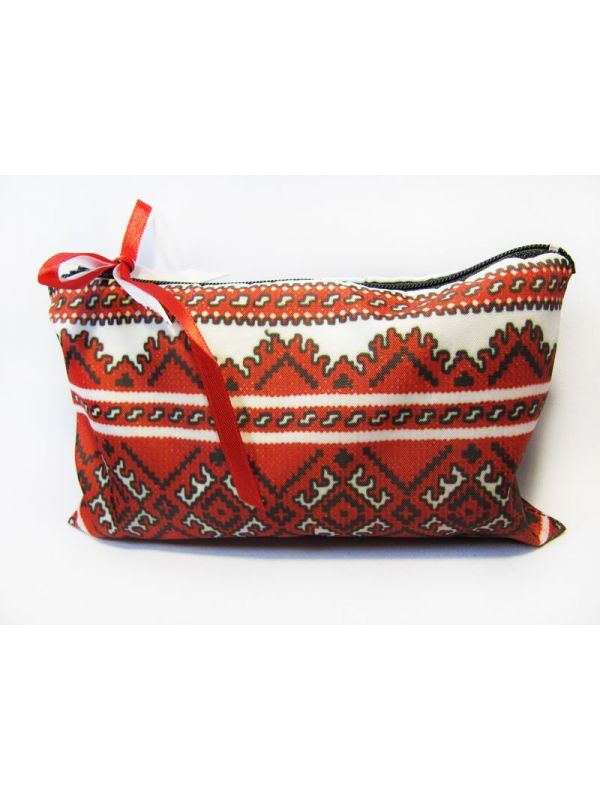 Чудова косметичка з тканини з красивим червоним узором похожим на вишивку хрестиком та прикрашена стрічкою. Незамінна річ в жіночій сумці.