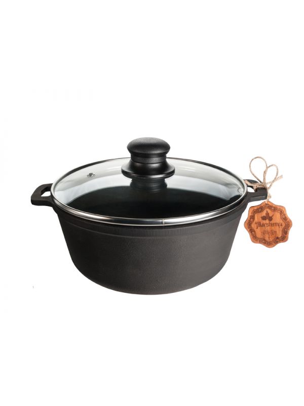 Високоякісна лита чавунна каструля з зі скляною кришкою довговічна, надійна та має високу теплоємність. Дану модель можна використовувати на всіх видах плит.