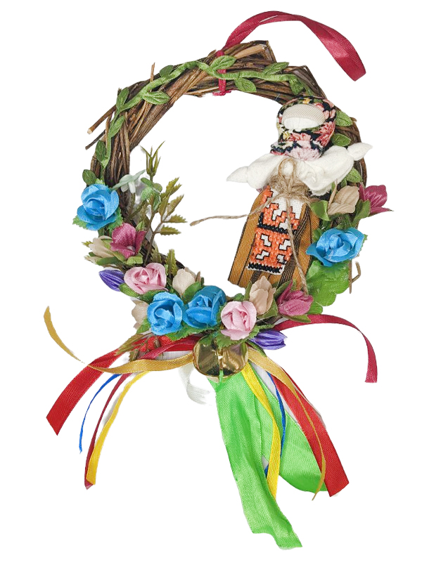 Віночок виконаний із гілок натурального дерева, прикрашений якравими стрічками, квітами. На низу прикріплений дзвіночок.