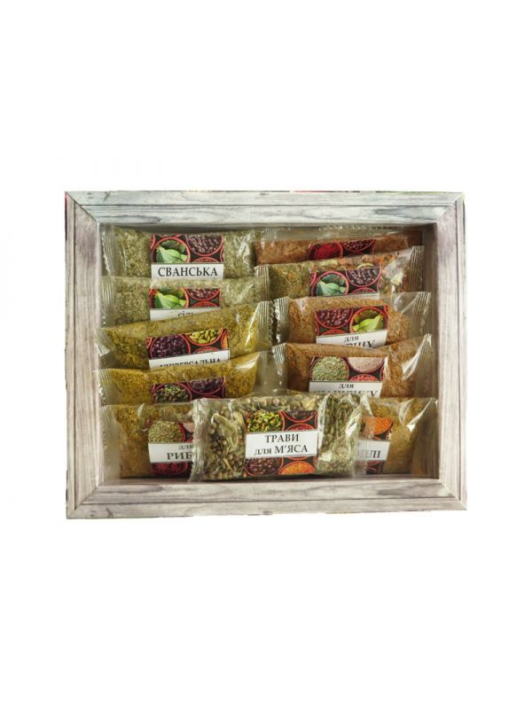 Ви можете придбати набір "Карпатські спеції" 9+1 (спеції для сала, борщу, шашлику, риби, картоплі, курки, фаршу, універсальна суміш, сіль по східному стилю та додаткова спеція в подарунок).
