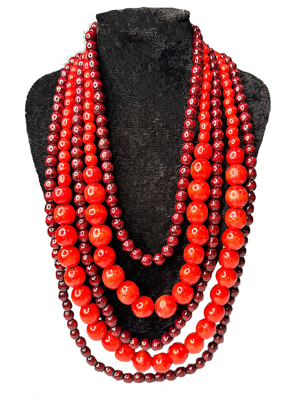 Наростаюче намисто червоне з бордовим – це вишукана етнічна прикраса, яка поєднує глибокі відтінки червоного та бордового у гармонійному градієнті. Кожен ряд намистин плавно збільшується в розмірі, створюючи ефект наростання й додаючи образу об’ємності та виразності.