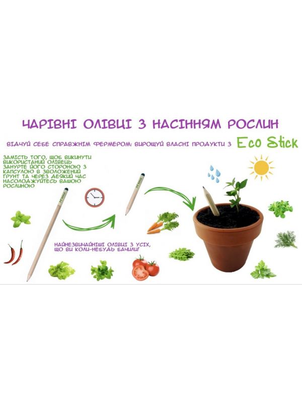 Особливість його полягає в тому, що в його кінчику розміщене натуральне ЕКО насіння, яке після вирощування стає повністю готовим до вживання продуктом! Принцип застосування максимально простий: використовуйте олівчик для творчості чи роботи - саджайте гранулою в вологий грунт - підливайте - спостерігайте за ростом рослини!