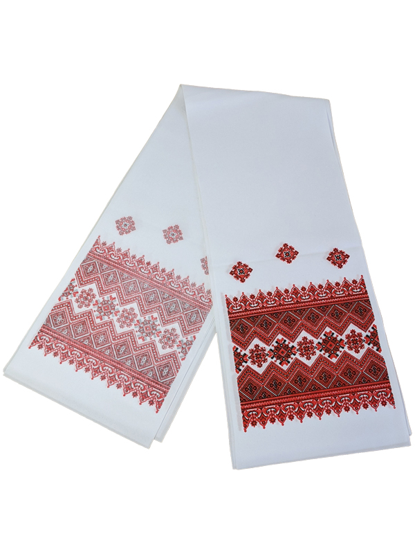 Рушник "Червоно-чорна вишивка" виконаний з білої тканини та прикрашений яскравим, друкованим малюнком в українському стилі. Родзинкою виробу є декоративне оздоблення під золото, воно надає блиск і багатий вигляд виробу.