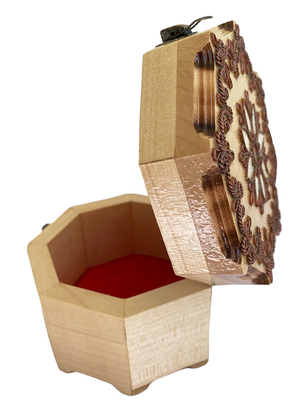 Ця унікальна восьмикутна шкатулка—справжній шедевр ручної роботи, яка стане не лише стильним елементом вашого інтер'єру, але й чудовим подарунком. Виготовлена з натурального дерева, вона втілює у собі традиції майстерності та природної краси. Верхню частину шкатулки прикрашає витончена різьба у вигляді квітки, що символізує "Квітку життя"—давній символ гармонії та енергії.