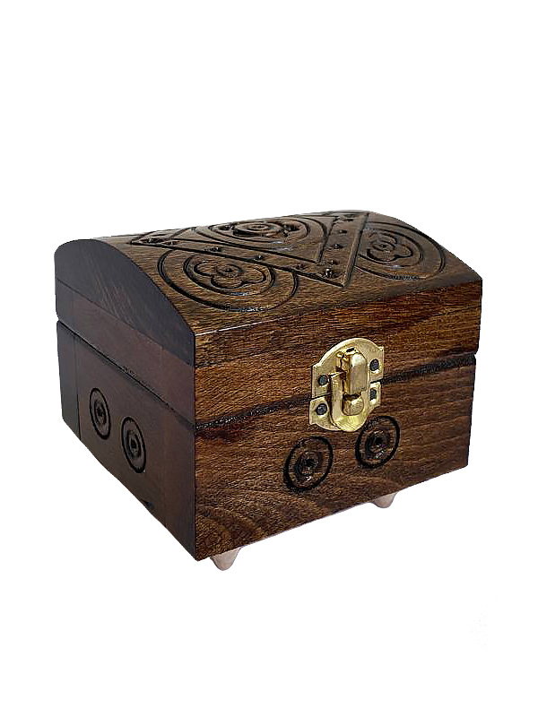 Ця елегантна шкатулка виготовлена з натурального дерева темного відтінку, що надає їй оригінального та елегантного вигляду. Вона має компактну квадратну форму та прикрашена оригінальним різьбленням на кришці, що додає виробу вишуканості. Шкатулка оснащена надійним металевим замком золотистого кольору, який не тільки забезпечує безпечне зберігання ваших коштовностей або інших цінних дрібниць, але й служить стильним акцентом у загальному дизайні.