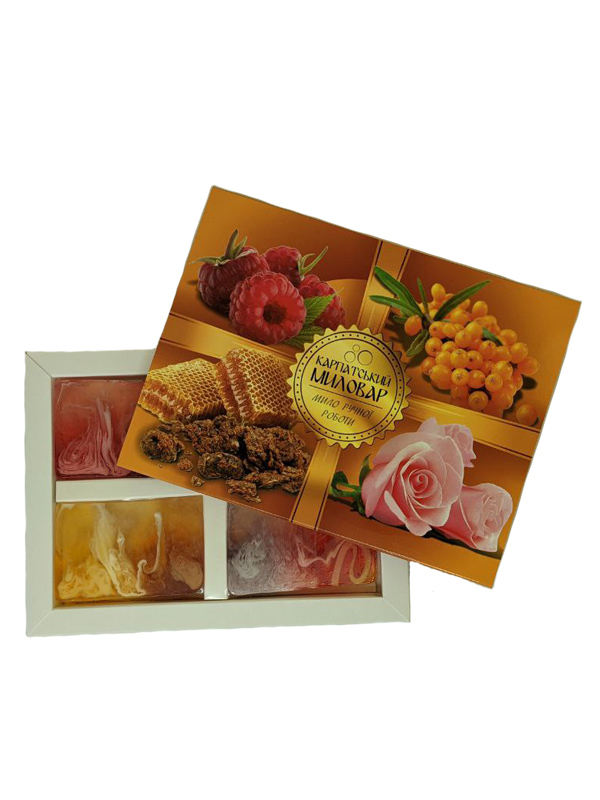 Набір мила 4в1 Карпатський миловар / (обліпихове, малина, троянда, медове з прополісом) є ідеальним подарунком для близької людини.