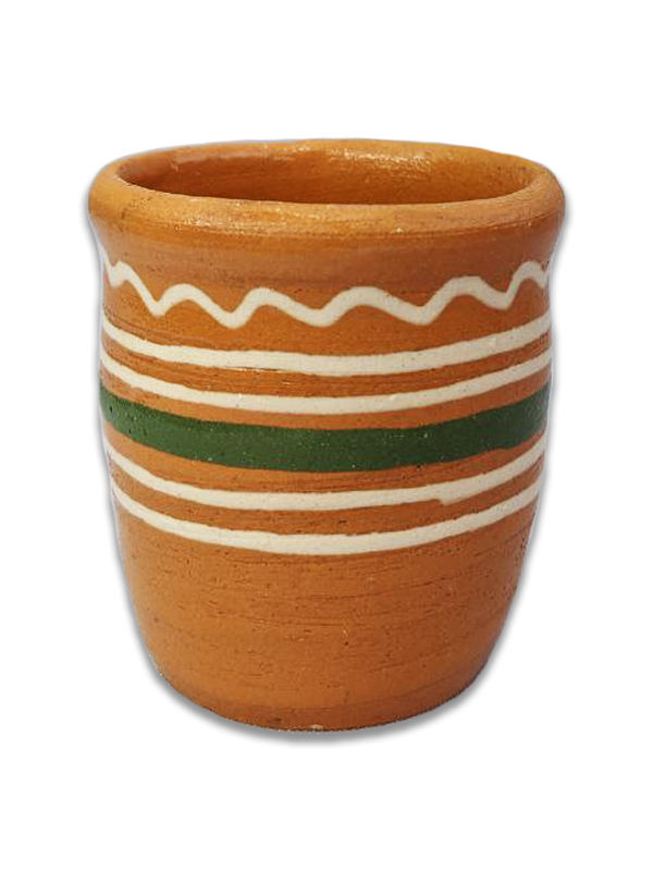 Невеликий стакан ручної роботи, зроблений з опішнянської кераміки, прикрашений багатим орнаментом.