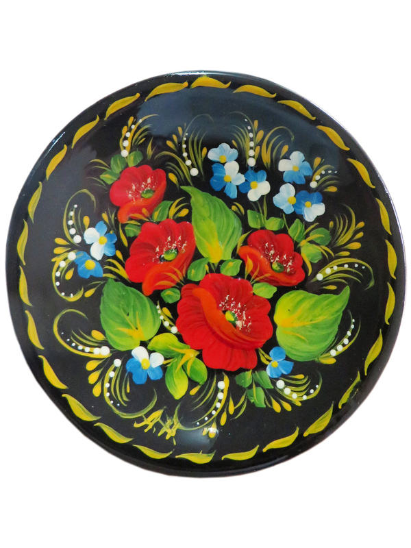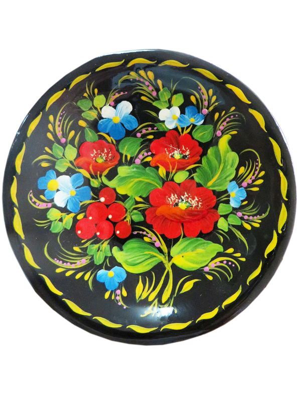 Ексклюзивна, настінна тарілка круглої форми "Квіти М2 10 см" з яскравими, розмальованими квітами на чорному тлі стане оригінальним доповнення інтер'єру.