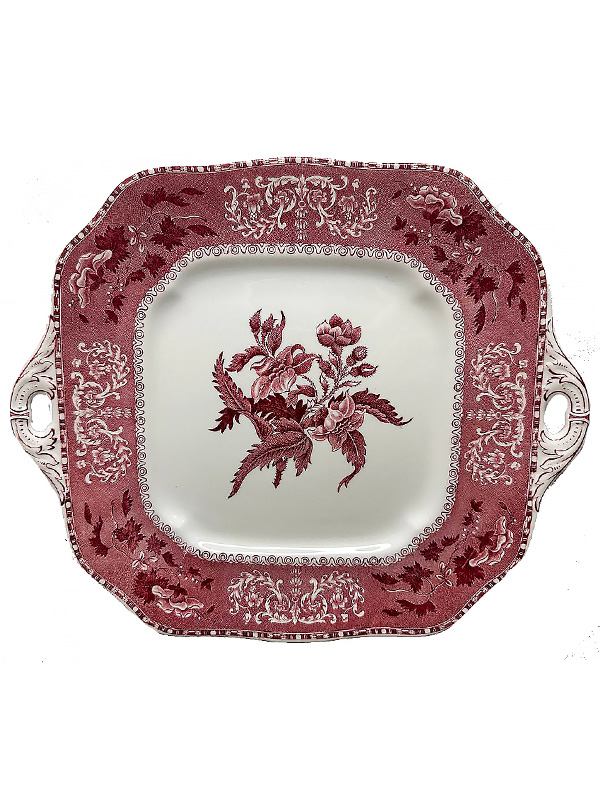 Опис: Це вишукане антикварне блюдо квадратної форми із закругленими кутами та двома витонченими інтегрованими ручками є справжнім витвором мистецтва. Воно виготовлене на історичній мануфактурі Mettlach. Центральна частина прикрашена детальною пасторальною квітковою композицією. Широкий борт декорований пишним рослинно-орнаментальним бордюром у стилі рококо. Характерний насичений малиновий відтінок надає виробу шляхетного вигляду. Блюдо має ніжні канелюри (ребристу поверхню) по внутрішньому краю. Стан колекційний, без тріщин та відколів, що робить його цінним екземпляром для колекціонерів або розкішним елементом сервірування столу.