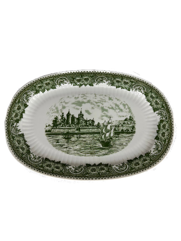 Опис: Це вишукане антикварне блюдо овальної форми є справжнім втіленням європейської класики. Центральну частину прикрашає деталізований пейзаж: величний замок на березі річки та витончений вітрильник. Внутрішній край виробу має ніжні канелюри (ребристу структуру), що додають йому об’єму та витонченості. Широкий борт декорований пишним квітковим орнаментом. Стан ідеальний, без пошкоджень. Чудовий вибір для сервірування столу або як цінний експонат у колекцію німецької кераміки.