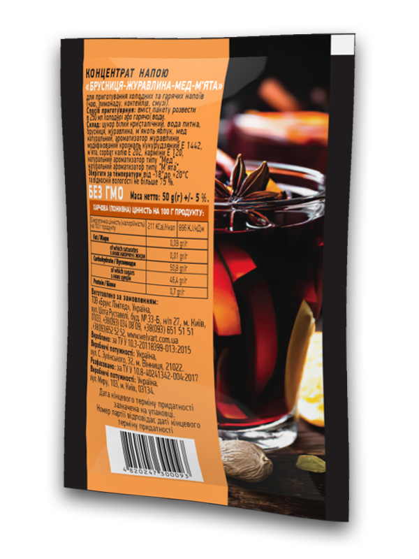 Концентрат напою допоможе вам приготувати смачний лимонад, чай, смузі, коктейлі чи інші напої зі смаком брусниці, журавлини, меду та м’яти.