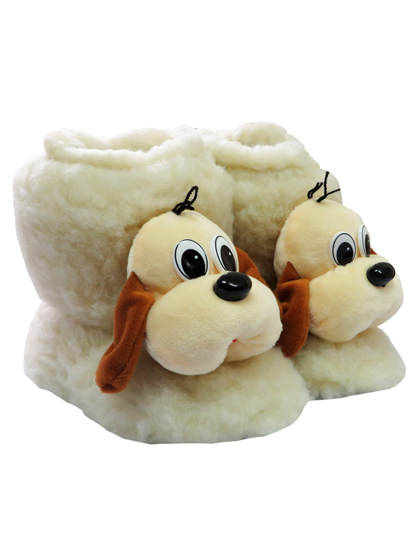 Дуже теплі та м'які капці-чуні з овечої вовни зігріють ніжки дитини в холодну пору року. Модель прикрашена кумедними цуценячими мордочками.