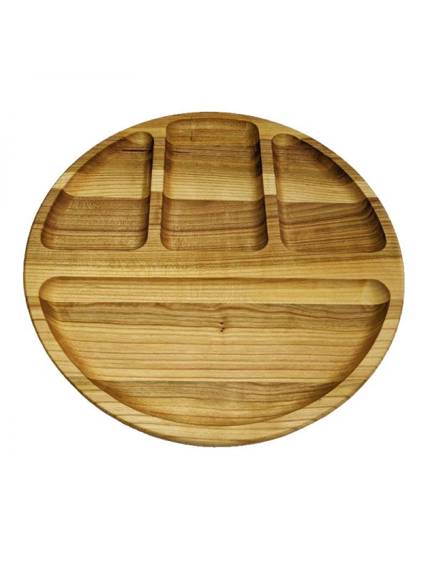 Красива дерев’яна тарілка на 4 відділи. У ній можна подавати декілька страв одночасно, або м’ясну нарізку, оскільки завдяти перегородкам нічого не буде змішуватись. Чудово підійде Також можна використовувати у ресторанах, кафе, пабах та інших закладах харчування.